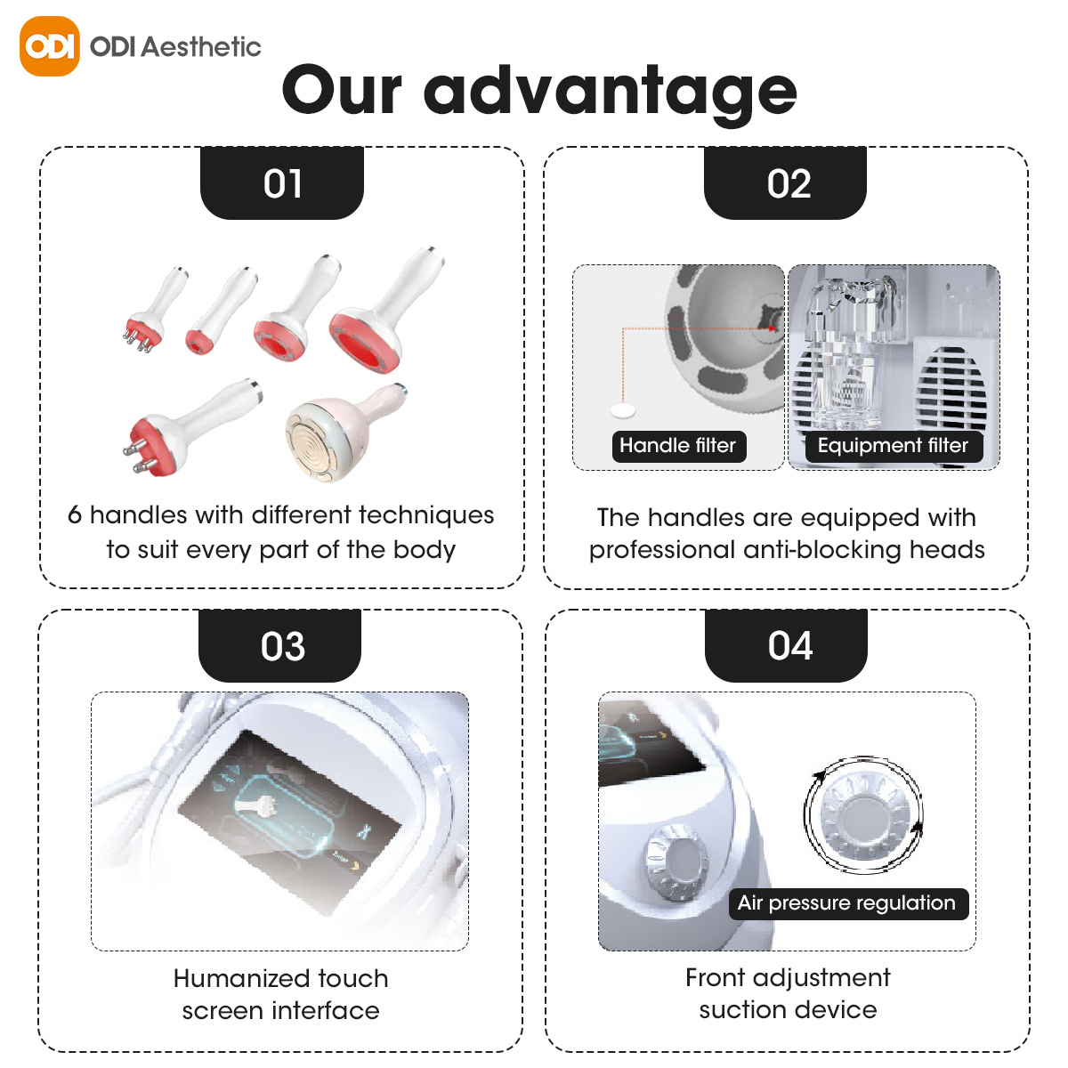| 1.VACUUM | The physical force of suction with a powerful force of 650mmHg stimulates the flow of blood and lymphatic system, thereby promoting metabolism and smoothing the elimination of secretions; |