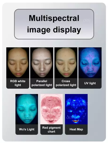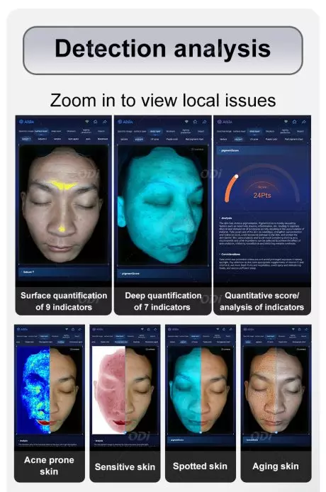 - Enlarge 2. Sebum T/U zone 3.Wrinkle 4.Spot 5. Pore 6. Blackhead 7. Acne 8. Skin tone 9. Sensitivity