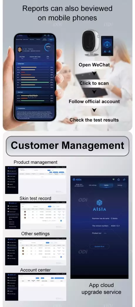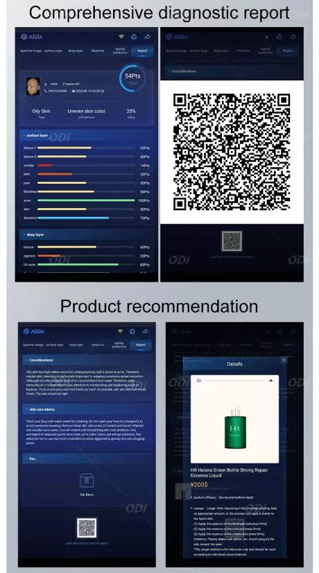 The Android version of the intelligent skin analyzer obtains facial skin images through 30 million high-definition pixels,using multi-spectral imaging technology, AI facial recognition technology, and deep learning algorithms,Using skin pathology model data annotated by 400000 professional dermatologists, facial analyzer is conducted to scientifically and accurately quantify 17 indicators of the skin’s surface and deep layers, targeting the five dimensions of acne, sensitivity, color, aging, and pores,Comprehensively evaluate skin surface and deep skin problems, provide customers with a basis for developing plans and setting treatment courses, and intelligently and automatically recommend care plans.
