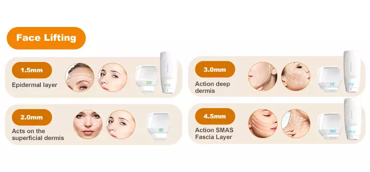 *Features 6 smart cartridges with depths from 1.5mm (epidermis) to 9.0mm (deep body fat), each with specific frequencies. This allows precise targeting of the epidermal layer, dermis, SMAS layer, and subdermal tissue. Includes a dedicated 2.0mm eye area cartridge for safe periocular treatment. One versatile machine professionally handles face lifting (jawline, wrinkles), neck rejuvenation, and body contouring (abdomen, arms, buttocks).