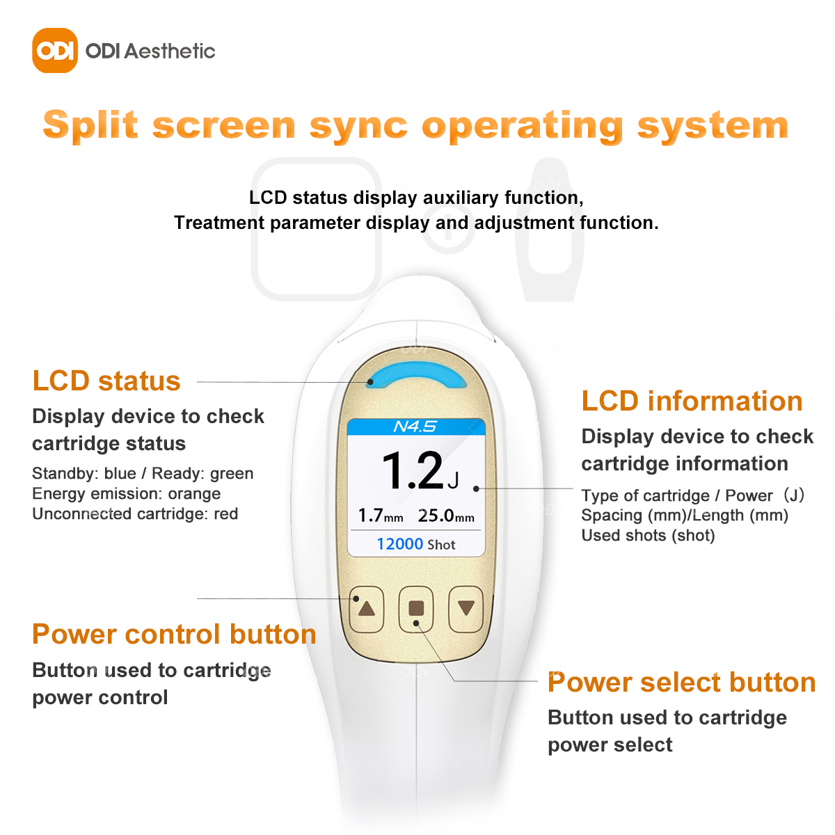 Real-time monitoring: Handpiece LCD displays energy output and temperature.