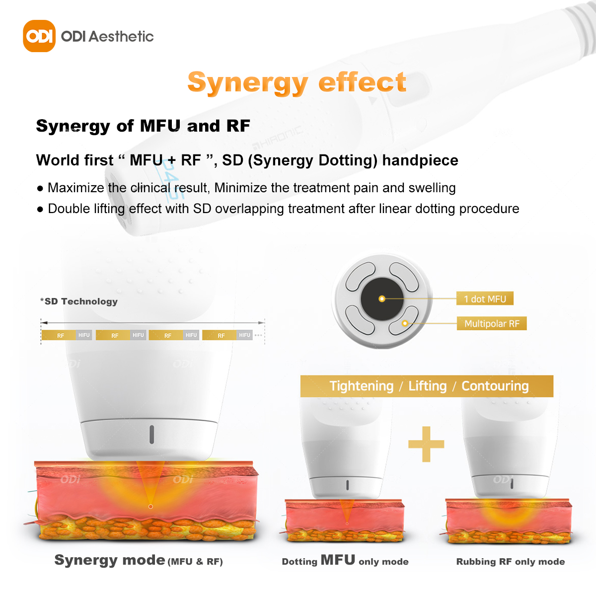 A4: odi hifu machine : MFU+RF Dual-Energy Synergy (SD Technology): In a single treatment, ultrasound and radiofrequency energy are emitted simultaneously at the same point, achieving a “1+1>2” effect for deep lifting and mid-layer tightening.