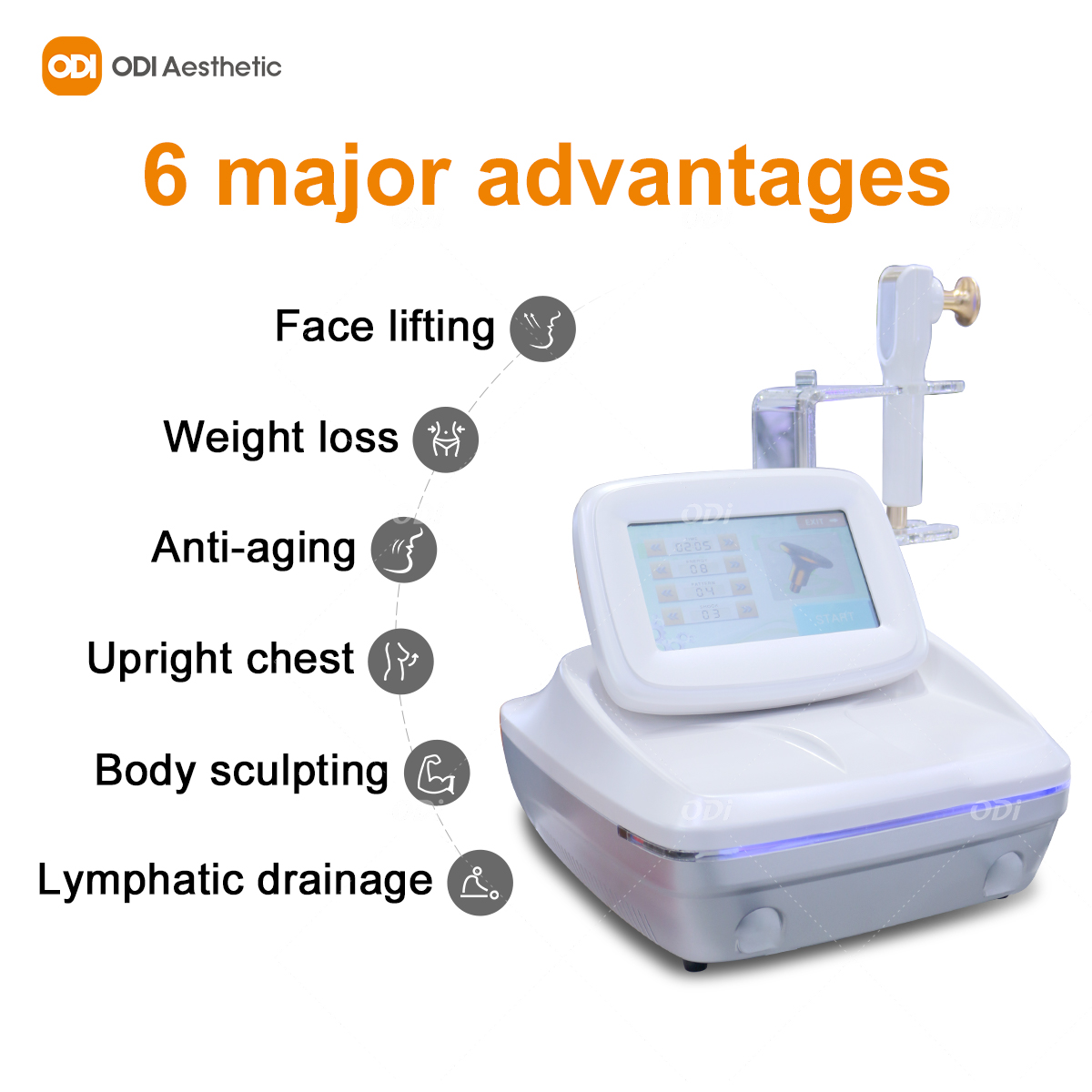 Odi RF lifting facial monopolar radiofrequency machine using the world’s new generation of non-invasive skin tightening technology to improve wrinkles, its patented frequency conversion focusing technology allows the frequency to float at 6MHz, which can achieve subcutaneous layered heating and accurately position it in the “fat layer, fascia layer, and dermis layer” to awaken skin elasticity; activate growth factors , repair collagen fibers, and deeply lift loose soft tissue structures.